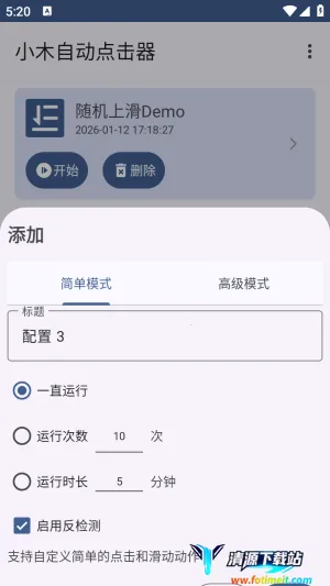 小木自动点击器 2026 官方最新版本是手机自动点击辅助工具,调用无障碍服务,无需 Root 权限。可自定义点击区域、间隔与循环次数,支持自动 Swipe 滑动,适应多场景,界面简洁,体积小,能保存配置方案,方便实用。