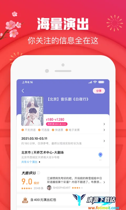 3. 购票超便捷:支持随时随地移动购票,操作简单高效,还有优质在线选座体验,支持同项目多票价多数量合并支付,电子票兑换便捷,购票体验流畅省心。