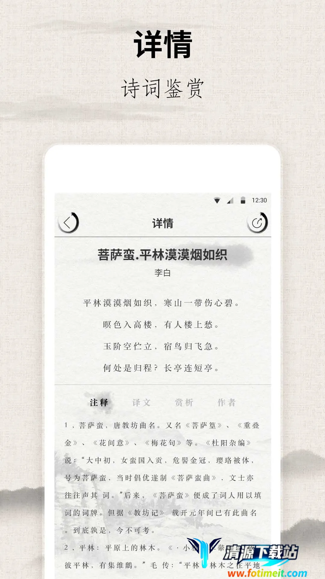 3. 阅读体验良好:支持多种阅读模式,满足不同场景需求,界面设计古朴典雅,契合古典文学主题氛围,还免费下载无广告干扰,提供纯净阅读体验。
