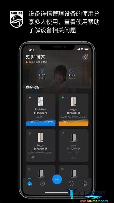 统一管理:作为飞利浦水健康生态的统一入口,深度适配旗下多种智能物联设备,通过一个APP就能完成全屋水设备的集中管理、远程操控与数据洞察。