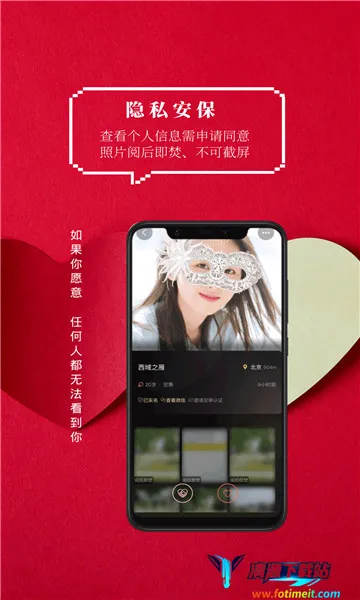 1. 隐私保护强:所有会员头像戴面具,查看头像、联系方式、照片等资料均需允许。照片阅后即焚,平台不允许截屏,全方位保障用户隐私安全。