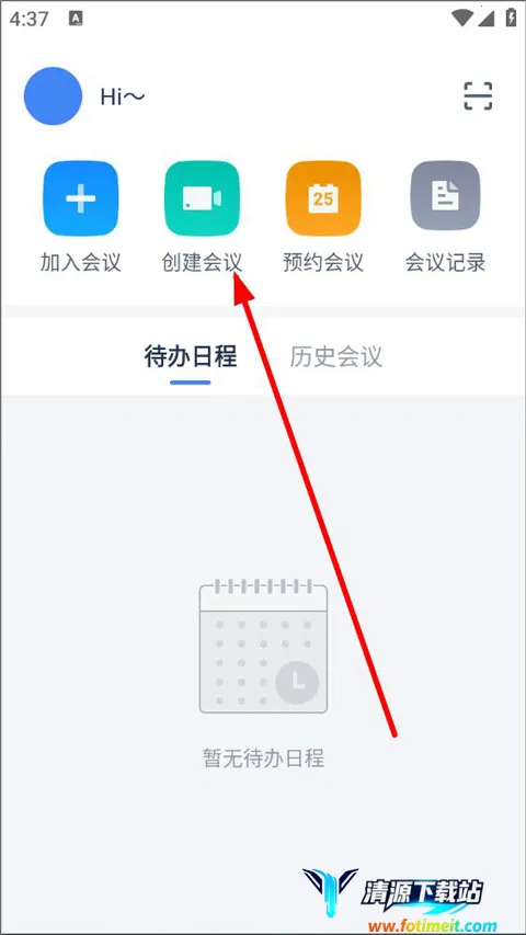 1、打开软件,进入首页,用户可创建会议、加入会议、预约会议以及查看会议记录等会,点击创建会议;