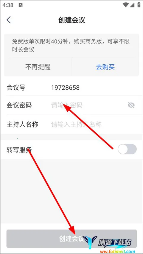 2、创建会议页面,输入会议密码、主持人名称等,点击创建;