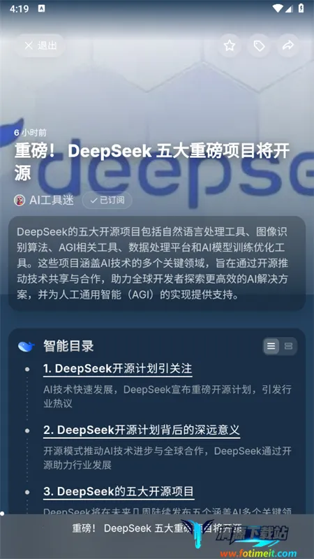 它的频道内容可筛选,去除低相关度信息,让内容更垂直精准。专题文章有智能目录和可视化呈现,降低信息获取门槛。还支持双语对照阅读。亮点也不少,能解析订阅未覆盖的RSS源,将图文解构为结构化形式提升阅读效率,以新形态呈现多种内容方便深挖细节。由深言科技与清华NLP实验室联合开发,功能强大,能订阅信息、生成智能大纲和思维导图、摘录存储关键信息、多轮对话交流、聚合同类文章,让你全面了解事件全貌,快速定位兴趣点,轻松获取知识,强烈推荐你来试试!