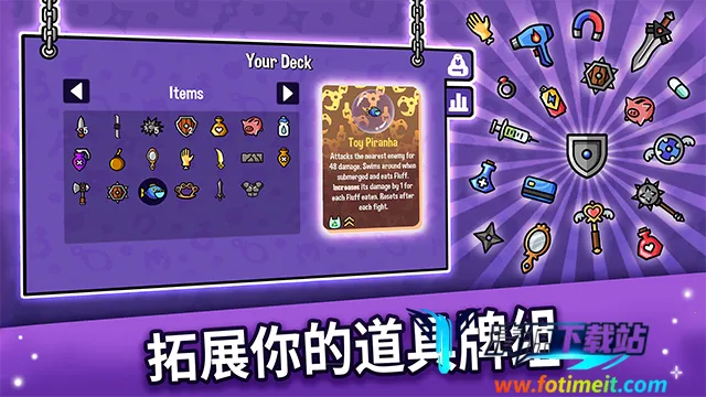 道具多样,分普通和金色,包括输出、防御、增益等多种类型。不同角色有独特抓取能力和推荐卡组,例如巫嘟多莉适合带温度计,磁仔铁子搭配磁铁和黄金匕首等。玩家要根据战场情况合理调配角色,利用道具组合应对各种挑战,在充满未知的地牢世界中不断探索、战斗,享受独特的游戏体验。