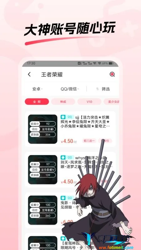 全品类的游戏覆盖:提供当下热门游戏王者、lol、和平精英等火爆新游的账号出租,海量游戏账号任你选。