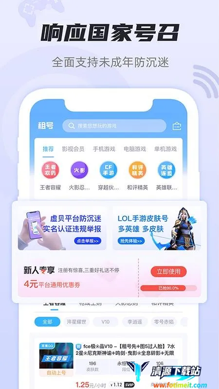 租号玩是一款专注游戏账号增值服务的平台。它整合海量优质账号资源,涵盖多种热门游戏。玩家无需账号密码,就能畅玩各类极品号。其优势显著,全品类游戏覆盖,百万量级优质账号任你选,端游手游皆支持自动上号,方便快捷。客服24小时在线,随时提供帮助。软件特色众多,特价专区优质账号0.5元起租,还有租送服务、专属会员福利等。在账号安全保障方面也很出色,有严格防沉迷系统,实名认证并添加人脸活体流程,能有效保护玩家权益。无论是想体验高端账号,还是出租自己的闲置账号,租号玩都是个不错的选择,能满足不同玩家的需求,让游戏体验更加丰富便捷。