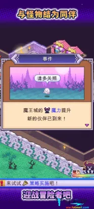 魔王城物语汉化版亮点多多。**轻松愉快的背景音乐**,为建造与战斗营造舒适体验。能自由经营魔王城,打造专属防御体系和魔物阵容。不断收集培养强力魔物,稳步提升战斗力。以打造最强魔王城为目标,优化布局与战术,挑战极限策略。在这里,可享受独特的像素经营策略乐趣,随心建造、招募,防御勇者入侵,书写魔王传奇。