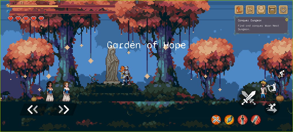 其玩法丰富,进入主界面点击新冒险按钮就能开启探索。能选择不同模式,操作简洁易上手,左侧操控角色移动,右侧有攻击、跳跃、冲刺与潜行按键。右上角任务栏可查看目标,完成有奖励。在地牢击败怪物能获经验升级,提升属性增强战斗能力,击溃首领就能通关并开启宝箱得珍稀奖励。
