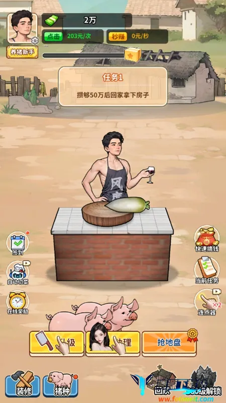 在这款游戏中,你能自由经营个性化农场,持续培育特色猪种。通过稳定收益积累金币,逐步升级设施、雇佣帮手、打通销售渠道,实现农场规模化发展。它融合养殖、建造、社交、剧情等多种元素,节奏明快,不肝不氪,带来持久新鲜感。以一人致富全村共富为使命,真实还原乡村振兴发展路径。设置丰富阶段式任务体系,涵盖多维度,助力资产稳步增长。资源收集与策略搭配并重,操作门槛低,上手即玩,新手也能快速掌握核心逻辑,享受稳定回报。支持好友互动与经验共享,增添社区温度。采用轻量化放置机制,离线亦可累积收益。