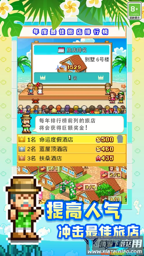 《南国度假岛物语》是一款别具魅力的模拟经营游戏。其像素风格画面清新独特,让人眼前一亮。在玩法上,自由度极高,从建造住宿设施、升级完善周边,到解锁各种游客层、触发丰富事件,再到进行投资吸引客源,每一步都充满策略性与趣味性。