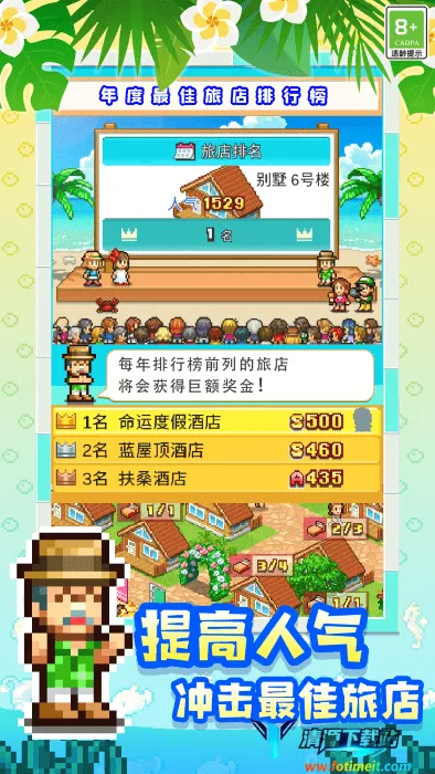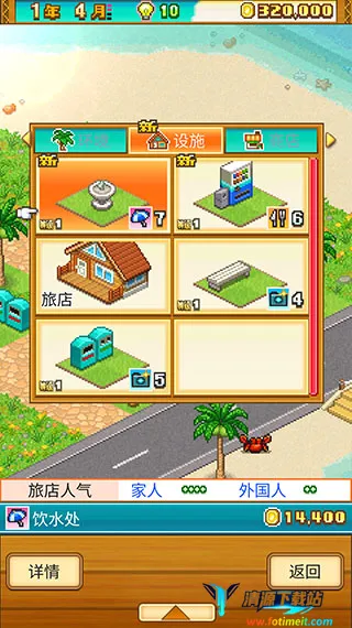 《南国度假岛物语》是一款超有趣的模拟经营游戏。在游戏里,你能打造豪华度假村,改造升级设施吸引顾客。它有着像素小清新风格,策略经营玩法,让你不断赚取金钱,乐趣无穷。新手玩起来也不难,能通过各种方式获得新建筑或设施,点击建筑查看详情还能使用道具。游戏有多种任务模式,一段时间后会出现购买选项,助你获取提升类物品、景观和新增功能。还有相性系统,相合的建筑物有加成效果。解锁游客层,不同游客层带来不同收益。各种事件可解锁,杂志投票能获金钱和物品。投资功能效果多样,推进游戏会有新投资项目。另外,游戏画面场景丰富,玩法简单易懂,能让你自由打造独特的度假岛,享受经营乐趣,快来试试吧!