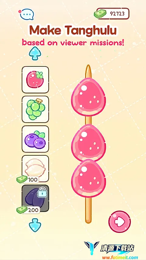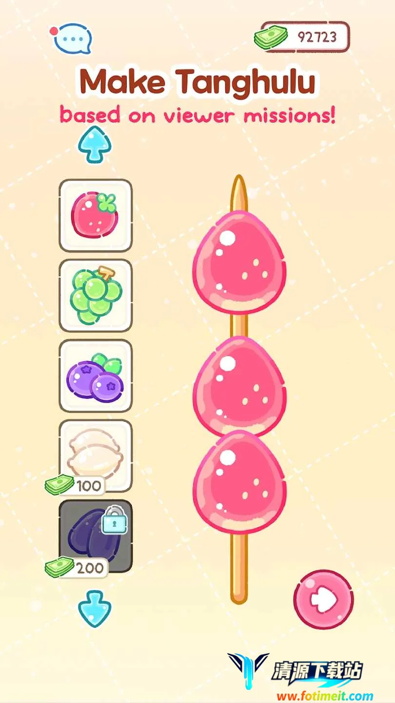 糖葫芦达人是一款超有趣的模拟经营游戏。在游戏里,你能化身主角露露,继承父母的糖葫芦店面,体验制作糖葫芦的乐趣。这里食材丰富多样,除了新鲜水果,还有松饼、地球软糖、青阳辣椒等奇特材料,能让你制作出口感独特的糖葫芦。你要掌握裹糖衣的达人秘法,裹出又薄又脆的糖衣。还能通过吃播宣传店面,完成观众任务获得赞助金来买新材料。游戏中不仅能制作糖葫芦,还能点外卖,在主界面点击Delivery就能进入外卖点餐界面。新版游戏还有拍照挑战,帮露露拍人生美照,拍得越好奖励越丰厚。它有着可爱的画风,能带来解压治愈的体验,完成各种任务和挑战,让你充分感受经营的乐趣,解决你想体验独特经营玩法的需求,给你带来轻松愉快的游戏时光。