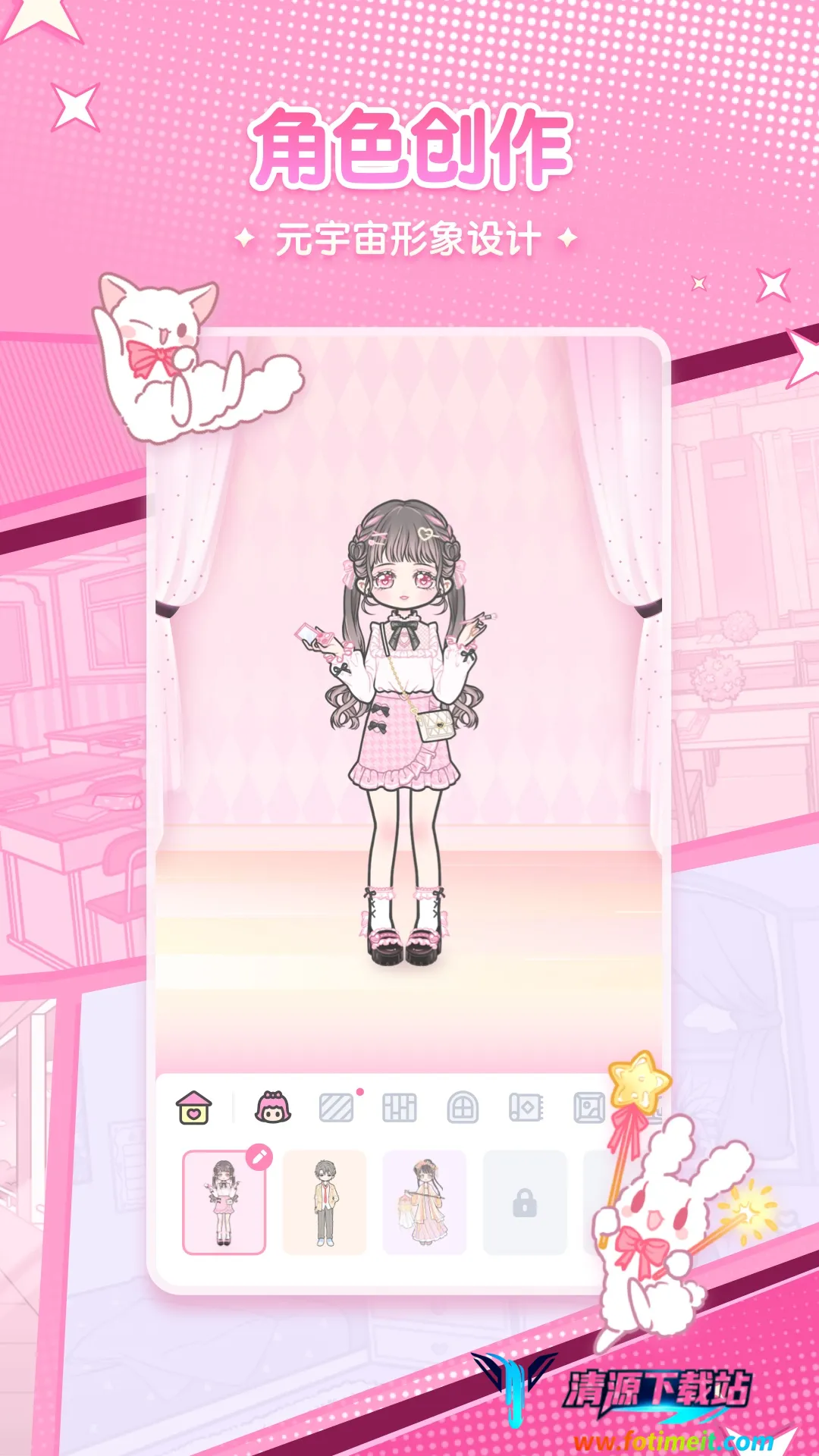 2. 自定义个性形象:能随意搭配JK服、LO服、古装等,还可定制发型、脸型、装饰等小元素,打造独一无二的个性化人物形象。