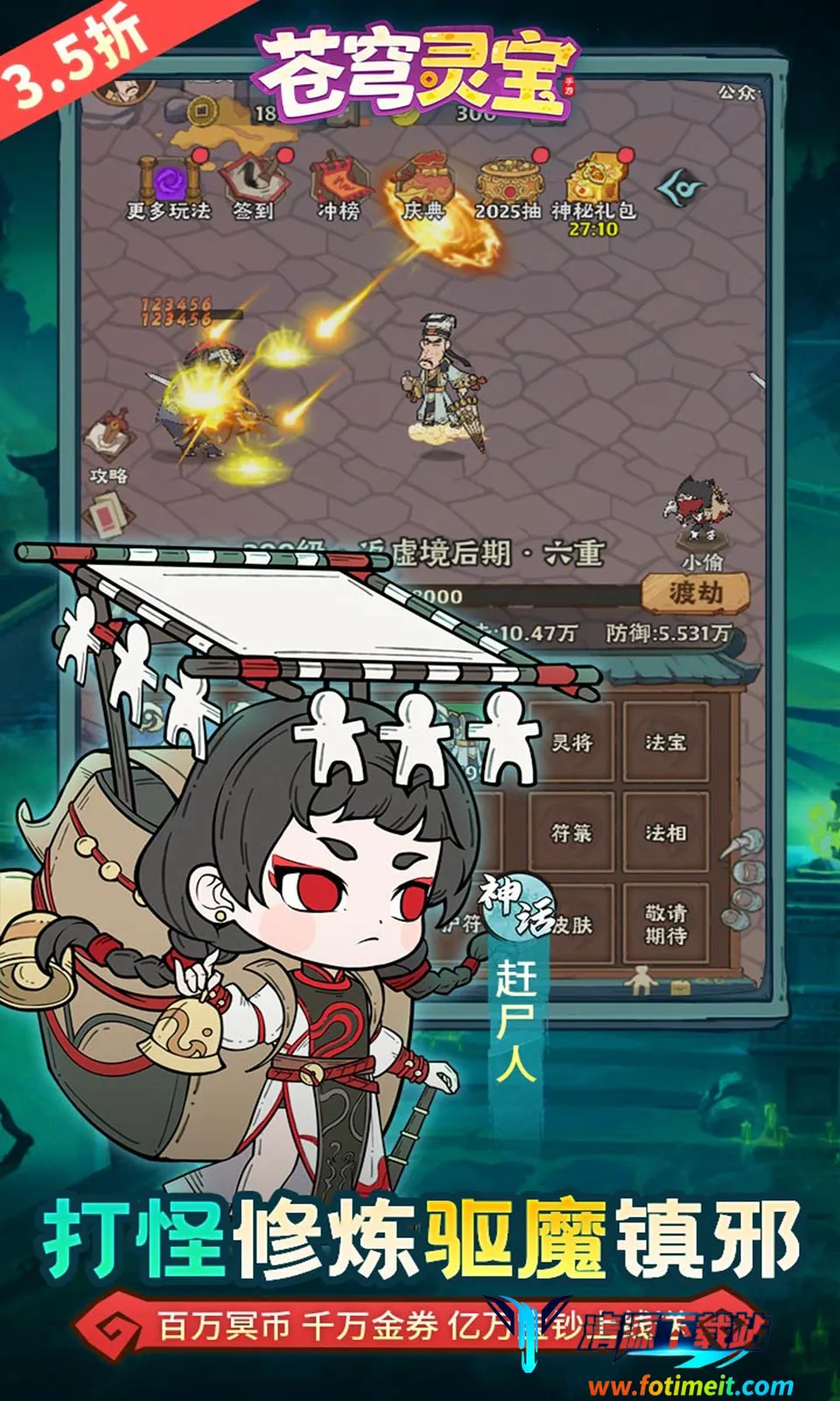 苍穹灵宝是道士修仙题材的 RPG 角色扮演休闲放置游戏。灵将复苏,有恐怖民俗与诡秘怪谈。优化开箱玩法,还有挖宝摇井等。新版特性丰富,如 13.5 折英叔抓鬼开箱,上线赠代金券,全新福利系统等,快来趣味修仙捉妖。