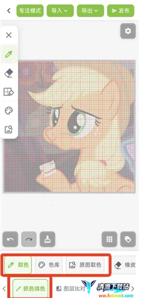 使用时,在本站下载安装后打开软件,操作简单。点击底部加号按钮进入创作空间,导入图片可自动转换为拼豆图纸,也能手动设计。色库选择色号或抓色填色,创作完成后点击导出保存。