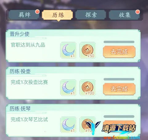 历练成就目前只有官职、投壶、抚琴三个成就任务,完成就可领取成就奖励。