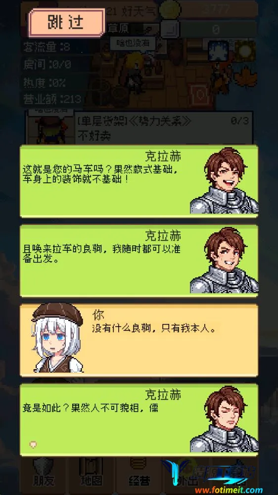 商旅马车是一款像素风模拟经营手游,玩家在异世界当商人,通过采集、跑商等多种方式赚钱。有22个地点、三百种物品,可招募上百伙伴,还有多样职业、坐骑、设施建筑及技能,MOD版免广告且免安装秒玩。