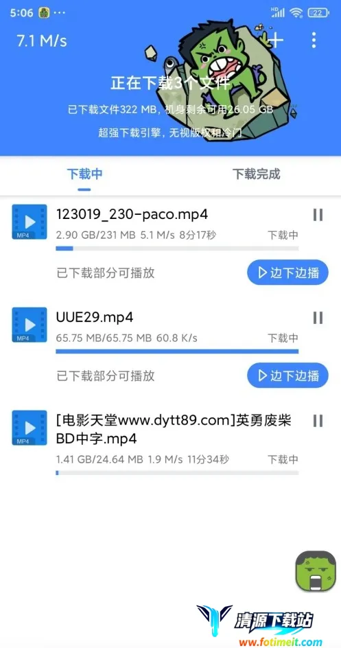 浩克下载器有着诸多出色之处。它是多功能磁力下载工具,支持多种文件格式下载,如ftp、磁力种子、https等,主流的种子文件能快速解析其中各类文件。其下载速度超快,基本可满速下载,家中带宽多大速度就多快,一个g文件几分钟就能完成。还支持边下边播常见格式,让你无需等待下载完就能观看。界面干净无广告,给你清爽体验。而且它完全免费,无需开通VIP,能满足你各种文件下载需求,轻松解决下载难题。