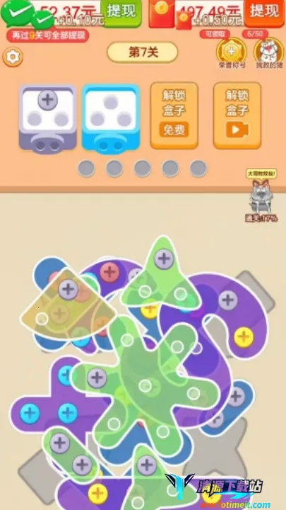 抓了个猪是休闲解压三消游戏,以放同色螺丝消除套小猪,得分越高套猪越多可换红包。关卡多样耐玩,有福利、排行榜。玩法易上手,节奏快,关卡日更,含陷阱障碍,可用道具,还能边玩边赚钱。