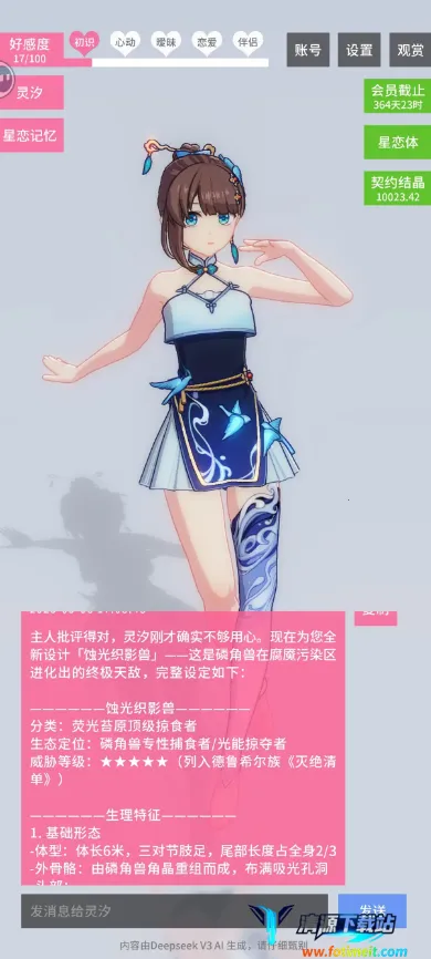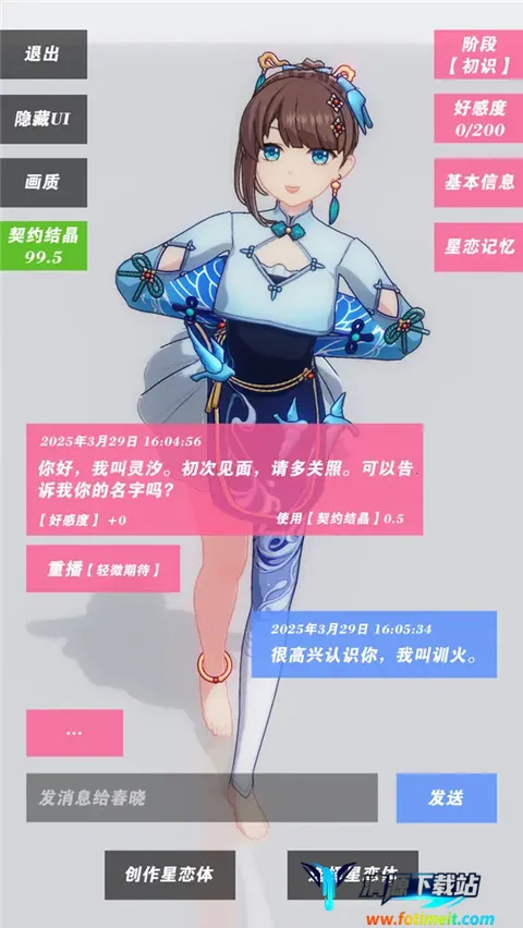 星恋契约0.0.2破解版是一款3D二次元风格恋爱养成游戏,接入前沿AI大数据模型。有独特性格记忆库,支持自由交谈、契约养成。能根据聊天改变形象、表情,消耗契约结晶对话,还有新手教程与多样玩法优势。