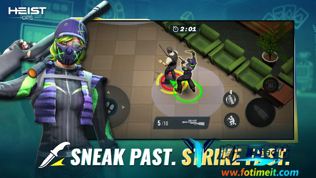 这是一款快节奏俯视角射击游戏。每次行动都巧妙融合策略潜行与动作元素。你要精心计划任务,挑选英雄并备好装备。潜行绕过守卫与摄像头到达金库,被抓时果断反击,全力进攻杀出重围。在时间耗尽前逃脱并确保战利品安全。收集战利品可解锁新英雄、升级装备,挑战更难劫案。游戏节奏快速,能让你收获丰厚奖励,带来纯粹乐趣,给你沉浸式的刺激体验,让你尽享射击与劫案的独特魅力。
