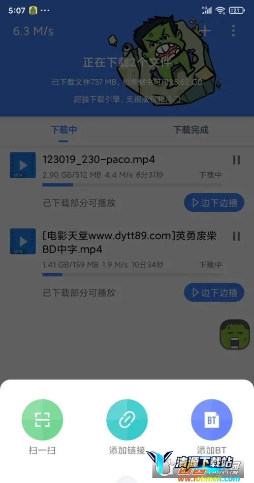 如果你想增强下载体验,浩克下载器是个不错的选择。它是一款多功能磁力下载工具,能帮你快速下载所需资源。采用极简设计,是纯粹的磁力链接下载工具,不限速,下载超快还免费。超强下载引擎,下载时能看到文件时间、大小等信息,支持边下载边播放,支持多种链接下载方式。能快速解析种子中的各类文件,选自己需要的就能极速下载。无需开通VIP,免费使用。有多重解析功能,支持多个文件一次性下载;可批量下载,无需等待。检索资源方便,无限制下载,速率可达10MS,让你享受飞一般的下载速度。搜索结果能显示文件时间和大小,方便复制磁力、BT种子链接,点击列表打开按钮可轻松打开支持磁力链接的应用。使用步骤简单,打开app点击测试磁力链接,复制粘贴到文本框解析,成功后点击下载,还能边下边播观看视频。快来试试浩克下载器,满足你的下载需求。