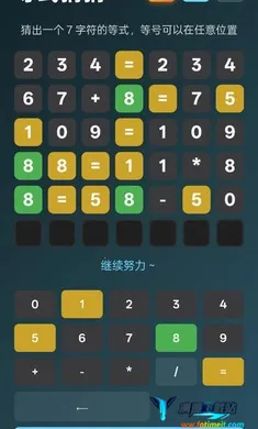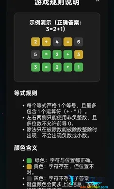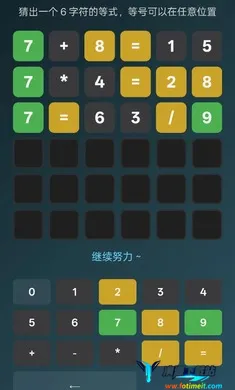 这是一款超烧脑的数字等式猜谜游戏。每关都有专属神秘等式,仅6次猜想机会。输入推测等式后,游戏会给出精准反馈提示,助你判断数字、运算符号及排列顺序是否正确。需根据反馈推理,排除错误答案,在次数用尽前锁定正确等式。**它能极致考验数字敏感度与逻辑推理能力**,让你沉浸在充满挑战的数字世界,享受推理的乐趣,不断挑战自我,突破思维极限,带来前所未有的游戏体验。
