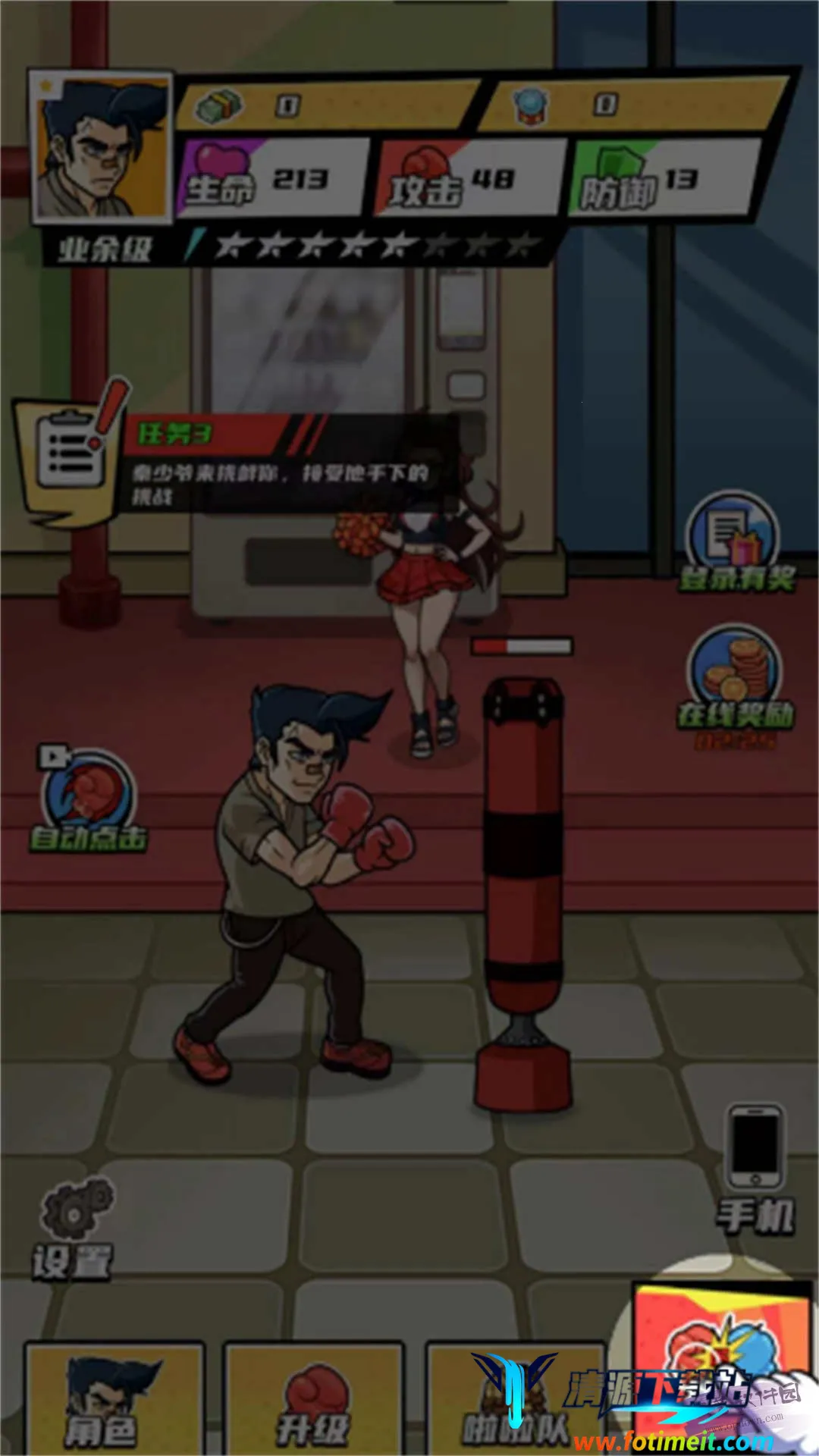 想体验拳王的逆袭之路吗?这款游戏就能满足你!它以经典拳击运动为基础,玩法超有趣。玩家扮演拳击手开启逆袭之旅,能深入感受拳击魅力。开局虽剧情老套,但按任务提示点击界面就能轻松上手。被赶出去后可经营自己的拳馆,收拾卫生、练拳,首个任务是打碎8个沙袋,点击屏幕就能击打沙袋。还能点击角色查看属性,针对性专项练习。游戏特色满满,场景是独特卡通风格,结合创新格斗玩法,能完成高难度拳击任务。可自定义角色训练养成,有多职业训练体系,还有众多关卡挑战赛。优势也不少,能踢馆展示实力,学习拳击技巧提升格斗能力。亮点更是吸睛,采用经典格斗元素,引入人气角色,有多种游戏模式,支持多人对战,社交系统完善,还有丰富时装可搭配,快来下载开启你的逆袭之路吧!