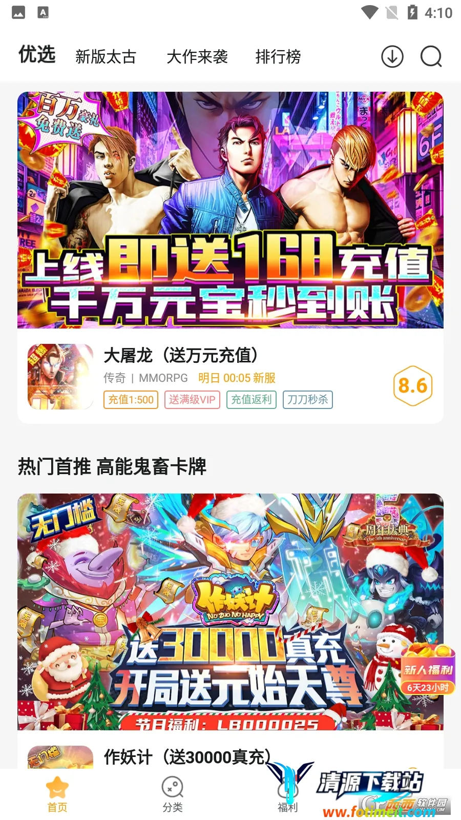 1、游戏分类全面且更新及时:提供最全面的游戏分类主题和推荐,资源丰富。无论是热门游戏、经典手游,还是各种类型的福利游戏,都能在这里找到。并且实时更新,让玩家第一时间获取最新游戏资源。
