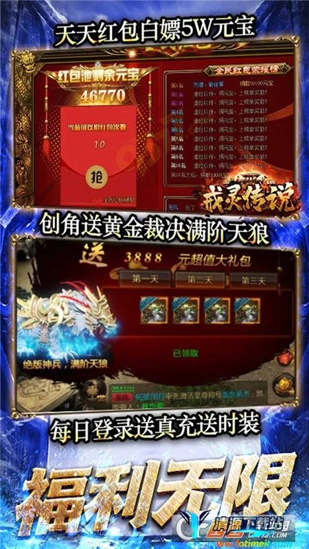 3. 超值福利:开服七日大狂欢,每天领取专属豪礼;冲级狂送超豪礼,快速冲级抢神装;超值礼包限时抢,战力飙升;钜惠累充高回报,专属珍稀神宠即刻拥有。