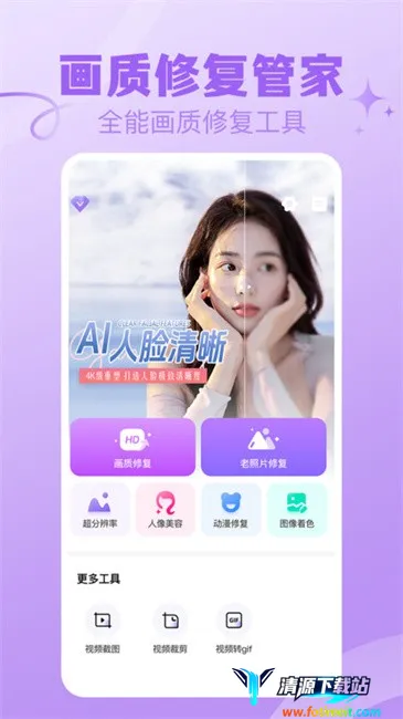 画质修复管家最新手机版是修复照片和视频的理想工具,功能全面,能处理模糊老照片、为黑白图上色、恢复受损画质,还有去水印等功能,操作简单,处理后效果明显提升,满足高标准需求。