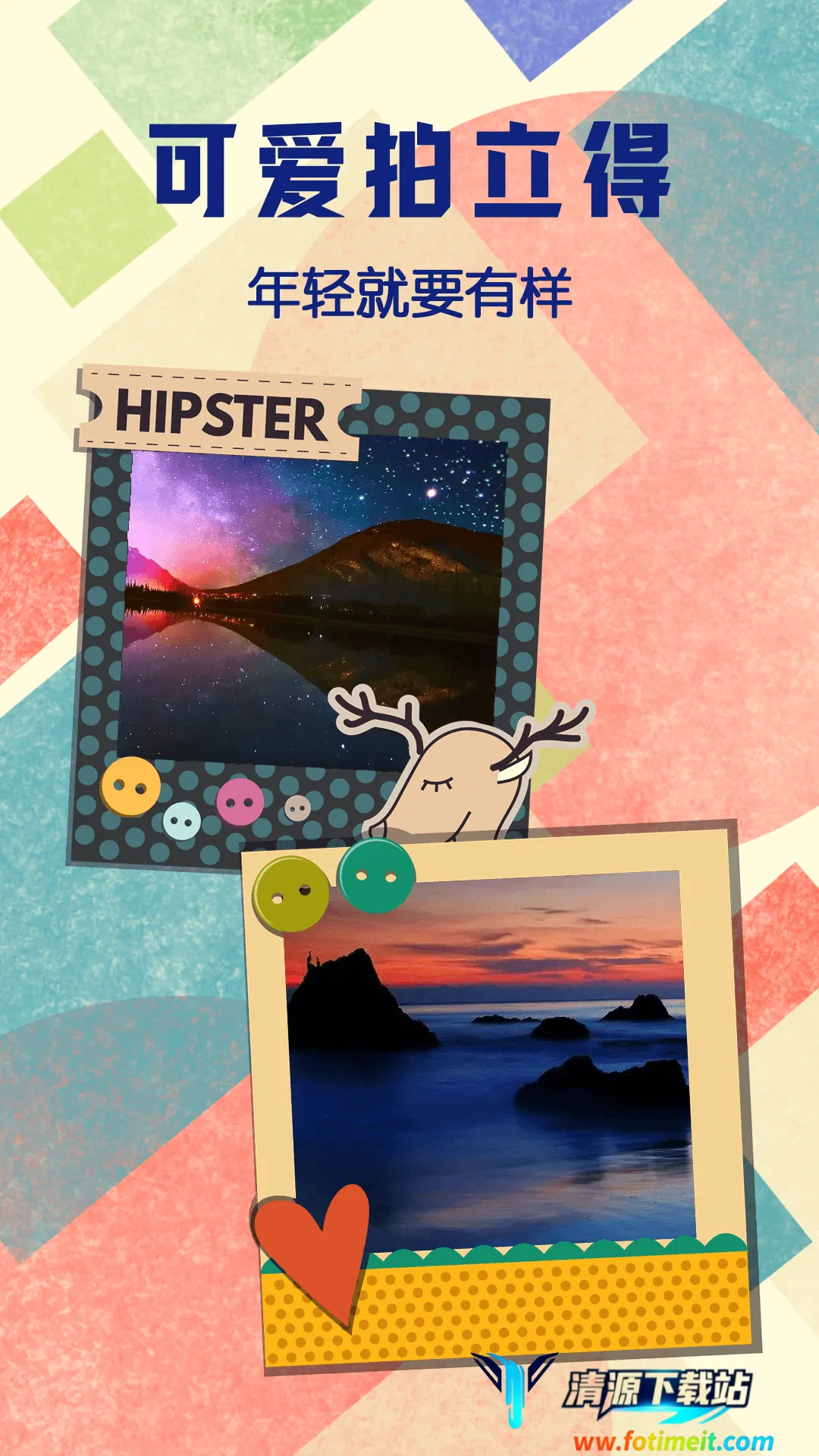 2. 贴纸丰富超多样:数十款可爱搞怪的贴纸随意更换,可爱清新复古港风等不同风格应有尽有,为照片增添别样感觉。