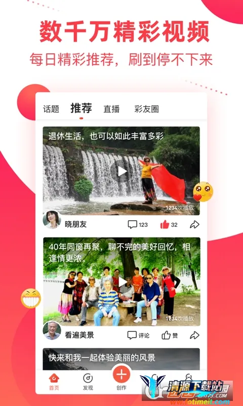 彩视亮点众多。它有热门推荐,精彩有趣的视频作品等你来上推荐。能一键分享到微信朋友圈、QQ 空间、微博等。有同城兴趣群组,可结识同城志同道合的好友,交流视频制作心得与生活点滴。高清直播一键开启,多人视频连线互动,还有百万曲库重温经典。其创作社区有爱有趣,能交流制作技巧、打赏作品、结交好友。加入或创建群组,可与好友一起创作、游玩、共享欢乐,让你在彩视开启精彩新生活。
