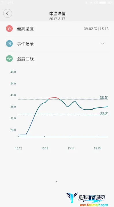 2. 自动绘制温度变化曲线图,针对设定阈值报警,还能记录服药或冷敷等相关事件,为健康提供全面支持。