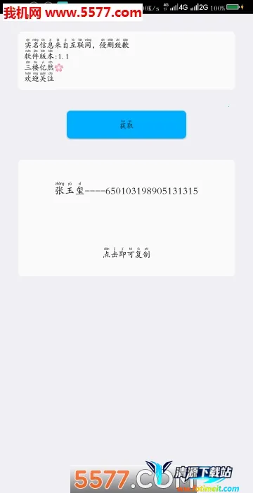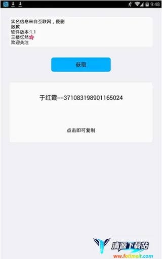 这款软件能助力玩家快速获取真实信息用于游戏实名认证。其认证方式简单,节省时间,能快速完成游戏注册。信息和资源更新及时,操作速度快。认证接口开放,可在其他软件客户端调用。系统信息保护专业,保存用户个人信息且查找方便。除常见认证,还能电话认证,获取信息可快速复制粘贴,按个人需求认证操作丰富。使用时安装运行软件,点击确定、获取,弹出实名认证信息后点击复制即可。它功能专业,能让玩家在不同游戏或软件中快速实名认证,玩游戏时操作无限制,适用于大部分手机游戏,值得有需求的用户下载一试。