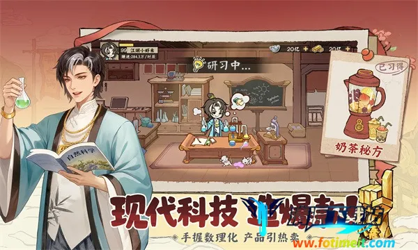 这是一款以穿越为题材的模拟经营手游。玩家穿越成古代商铺老板,运用现代商业知识经营店铺,招募员工,还能与其他玩家组建商会打造商业帝国。