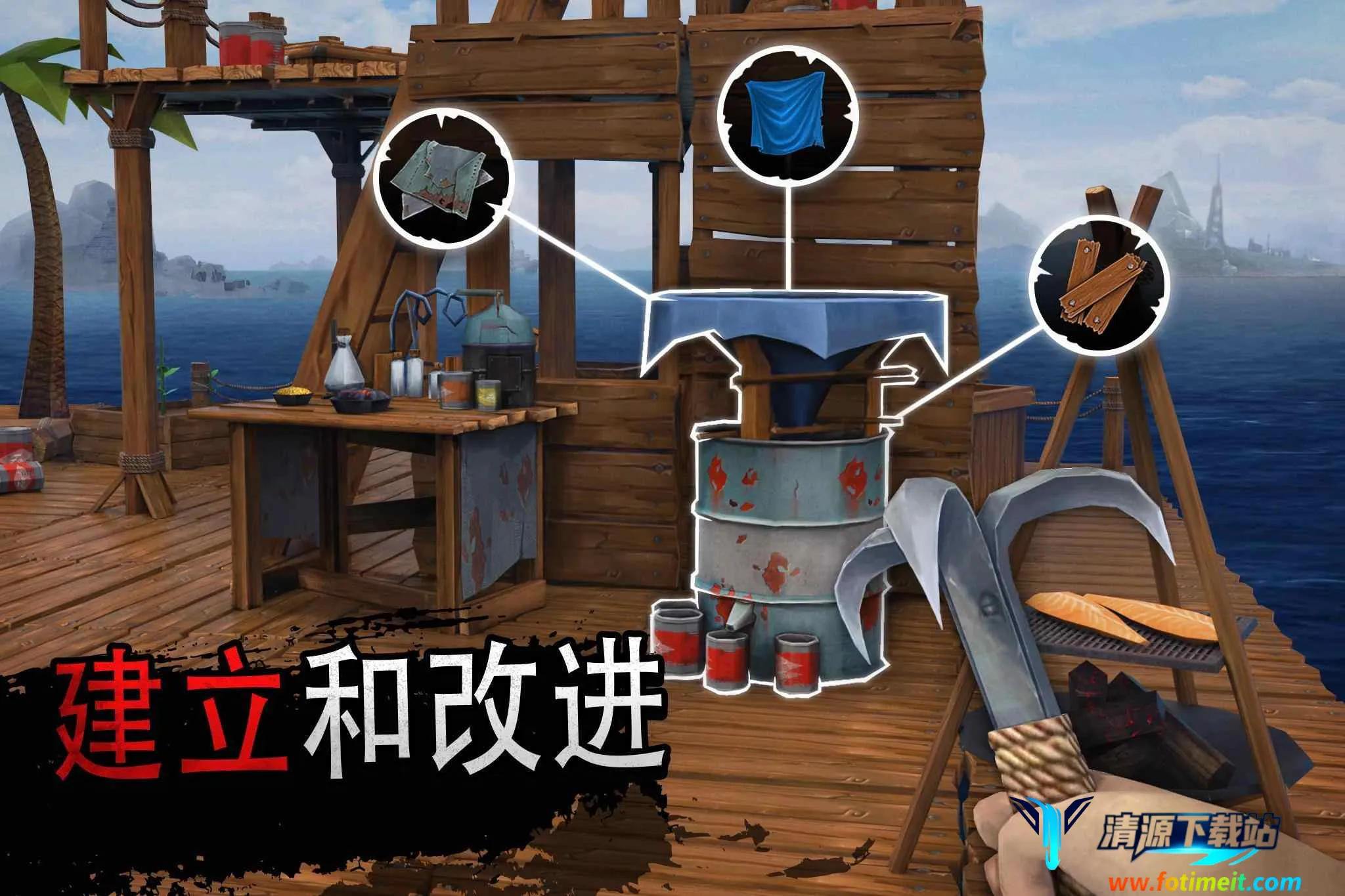 资源丰富:游戏中,各种资源获取途径多样。通过投掷钩子抓住物品和资源,像漂浮的箱子、桶以及残骸等,都可能包含重要资源,可用于建造木筏、制作武器及防御物品等。