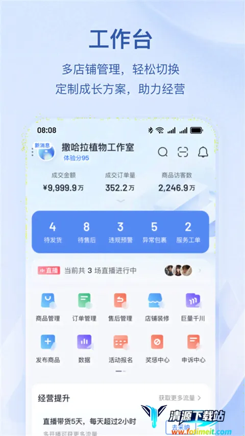 3. 实现数据化管理:是数据化管理帮手,能让店铺运营更有条理,商家可实时查看核心数据变化趋势,各项数据一目了然。