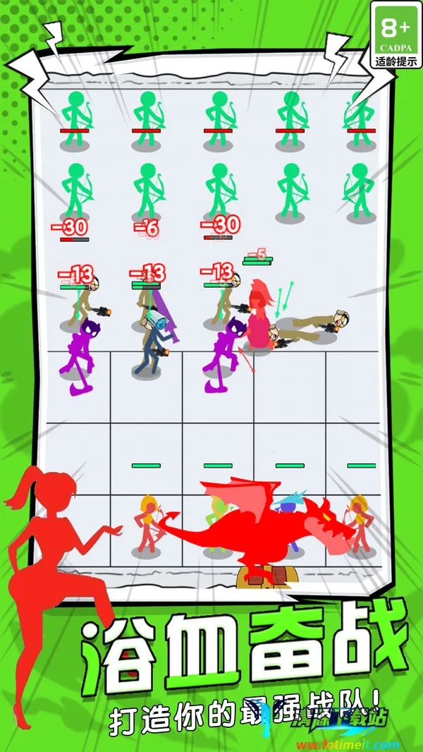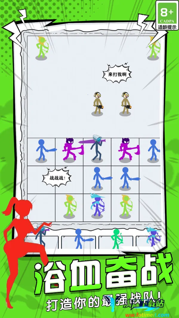 这是一款结合卡牌养成和策略布阵的火柴人对战游戏。玩家可召唤蓝剑士、绿弓手等角色,近战与远程互补,通过拖拽布阵构建战术体系。点击召唤、拖动部署就能完成阵容调整。随着敌人强度提升,玩家需灵活调整策略,如权衡弓手输出和剑士防御。