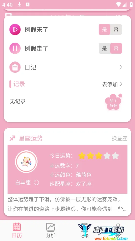 3. 功能丰富实用:不仅能记录和预测经期,还能记录心情、健康细节,生成详细经期报告,根据记录数据提供调理方式,全方位呵护女性健康。