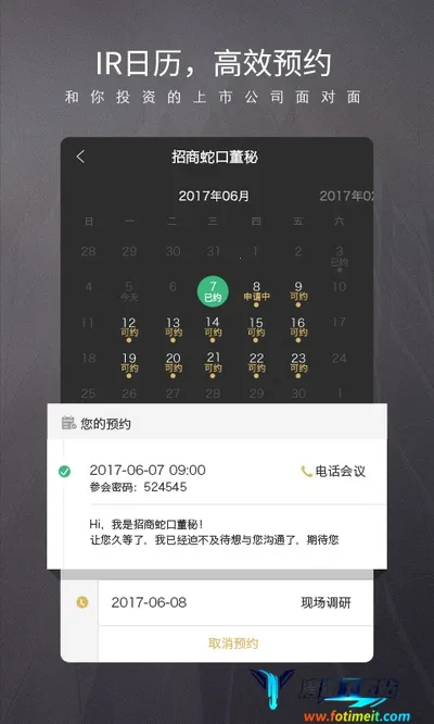 路演中是一款功能丰富的商务路演服务平台。它为上市公司、券商、基金公司等提供线上线下一站式路演服务,涵盖会议预约、信息订阅、线上直播等。其优势显著,能精准推送数据,为发行方匹配潜在投资者,提升沟通成交效率,成为重要分销渠道。拥有海量优质人脉资源和上市公司,展示清晰的董事秘书预约日程,提供多种预约方式。还打造数字化投资者关系SaaS工具,实现数据化管理。提供全面的路演类型,打造专业机构投资者入口。精心设计系统路演方案,有多种复杂场景解决方案,显著提升资本品牌曝光率,覆盖众多投资者,提供专业服务,保障路演安全顺畅,是一款助力企业与投资者高效交流的优质平台。
