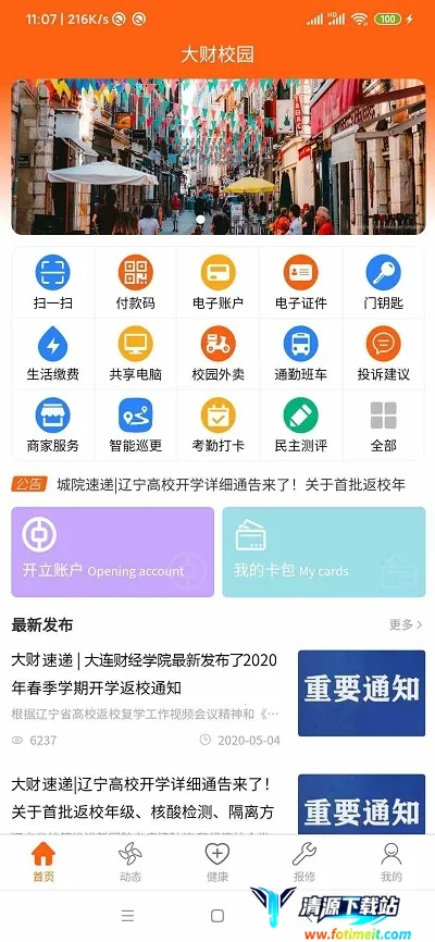 大财校园是大连财经学院为师生打造的智慧校园综合服务平台。它摒弃了传统实体校园卡,深度融合线下一卡通系统,提供各类生活及学习一站式服务。