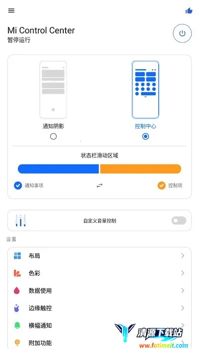 这款专门为miui系统设计的桌面控制主题软件,能够为用户设计多个好用的中心控制方法。它主要包含页面展示、音量自定义以及设置界面三大核心功能模块。在控制中心可调整状态栏触发区域,并对通知面板与控制项的位置进行调换。布局设置允许用户更改图标显示形状,并自定义控制中心顶部的文本内容。图标形状设置将决定功能按键的排布样式,完成调整后确认即可生效。此外,它还具有全色自定义、强大的自定义手机选项、可调背景类型、高级自定义通知栏、高级音乐、快速回复、自动捆绑、自定义背景图片等特色功能。借助独特的控制中心,用户可以轻松定制手机,快速访问控制中心中的相机、时钟和其他设置,还能将快速设置与通知分开,根据自己的喜好配置所有功能。