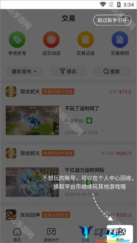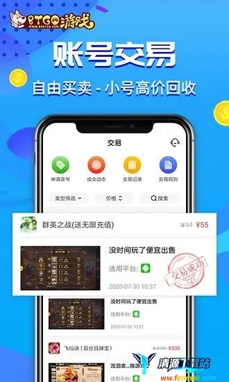 3、账号处理灵活:具备账号回收功能,玩家可将闲置游戏账号通过平台回收换金币,实现免费玩氪金游戏。交易页面还能进行账号买卖。