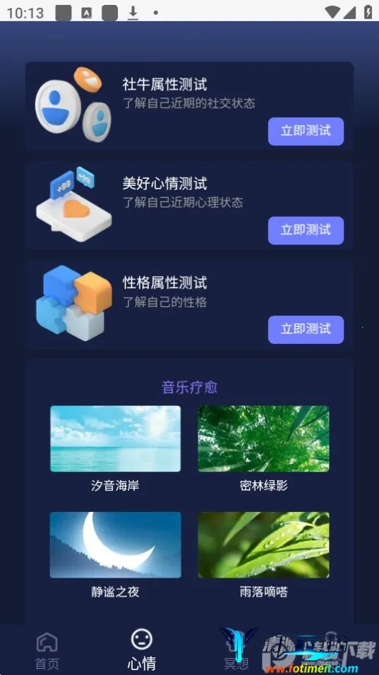 心灵氧吧是一款超棒的解压助眠软件!它能帮你解决诸多睡眠问题。软件里有海量白噪音助眠音频,经专业音频疗愈师审核,声音类型多样,不管你爱大自然的安宁声,还是细碎的摩擦声,都能找到。睡前瑜伽音乐助你放松身体,更快入睡,告别黑眼圈。还能保证睡眠质量,提高注意力与学习效率,合理规划睡眠时间,助力增肌减脂。特色的冥想功能,引导你进入冥想放松身心,缓解焦虑压抑。心理测试问卷让你掌握自身心理状况,音乐疗愈让心灵得到全方位放松。设计风格治愈,以绿黑为主色调,给你带来轻松之感。有了它,就像拥有了专属的解压助眠小天地,快来下载体验吧,让你每晚都能享受优质睡眠!
