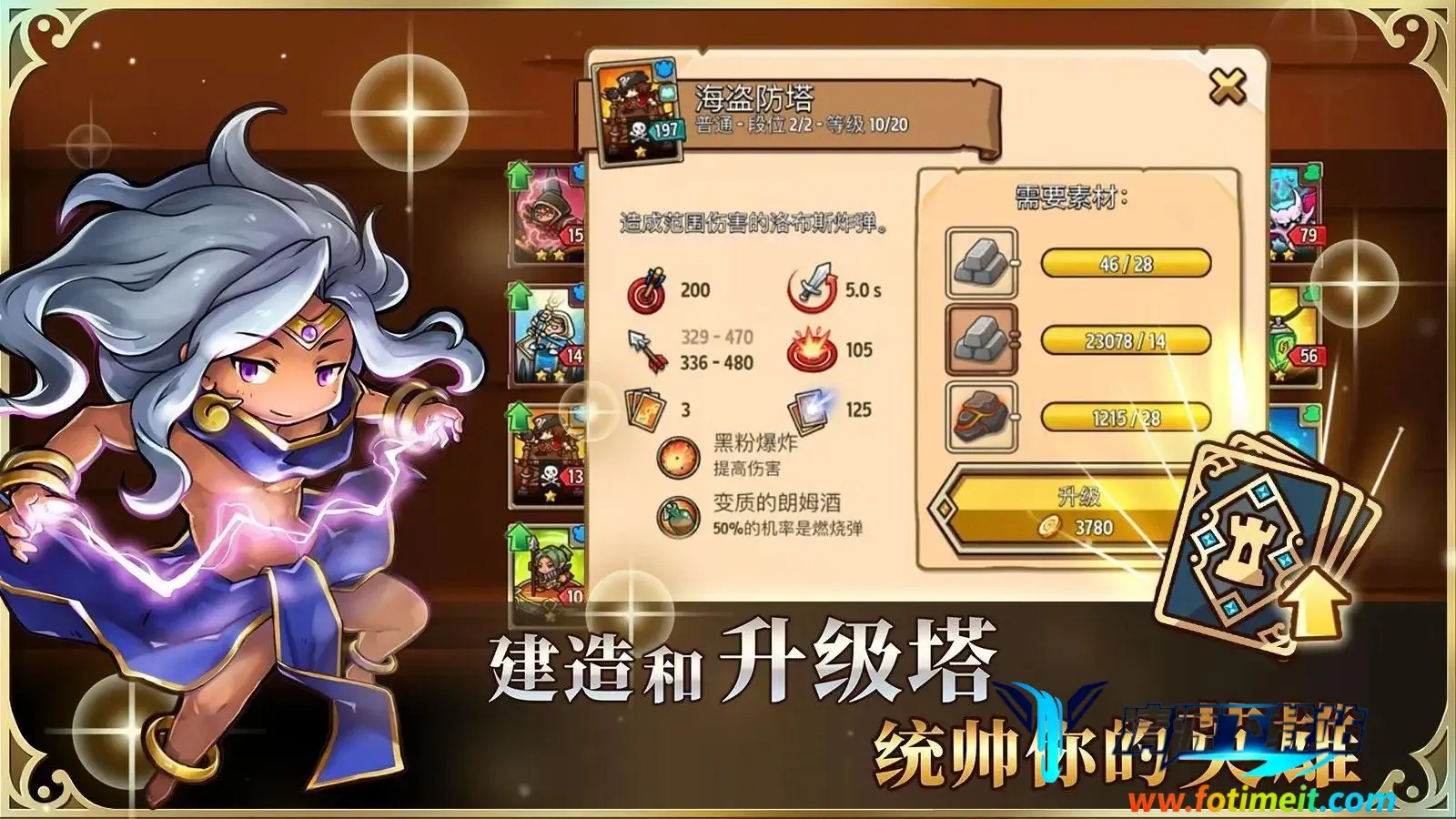 2、独特英雄养成系统:能解锁20位英雄加入阵营,自定义英雄头像,为角色配备增强属性的装备。还可使用法术召唤飞龙烧燃敌人、用冰块冻结敌人或用治疗魔法治愈英雄,让战斗更加精彩。