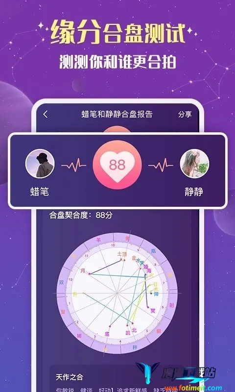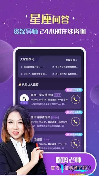 专业服务:有资深导师提供24小时咨询服务,能针对情感问题分析解答,还可进行星盘解读、缘分合盘测试等,为用户带来专业的星座相关服务。