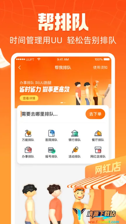 2. 服务多样:涵盖代买、代送、代排队、uu帮帮等丰富服务。724小时代买,足不出户购遍全城;专人专送代送,59分钟送达;代排队省时省心省力;日常保洁、临时保姆、小时工、货物搬运等紧急求助快速搞定。