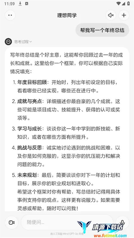 理想同学亮点众多。回答速度超快,能短时间内全网搜寻信息并总结。它还能带着用户看世界,生活中遇到不明白的都可提问。不仅能生成文字内容,给定主题还能自动生成绘画创作。其界面设计简洁大方,安装包小,下载速度快。而且首次将对家人的陪伴从车端迁移到移动端,让用户在多设备上享受一致的人工智能体验。依托自研大模型MindGPT打造,模型迭代速度快,升级后的大脑让其记忆、规划、工具、表达能力全面提升,更懂用户,时刻陪伴。